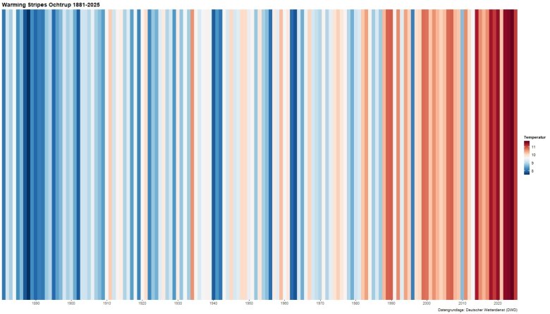 Nicht nur Hitzewellen, auch Starkregen und Dürrephasen machen deutlich, dass Klima und Wetter auch im Kreis Steinfurt immer extremer werden. Das bilden auch die sogenannten Klimastreifen (orig. „Warming Stripes“) des Wissenschaftlers Ed Hawkins ab: Sie symbolisieren die mittlere Jahrestemperatur seit 1881 und veranschaulichen den Temperaturanstieg bis zum Jahr 2023.